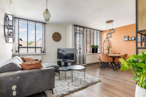 Via de voordeur kom je binnen in de hal, waar zich het toilet, de trapopgang en een handige trapkast bevinden. Vanuit hier stap je de woonkamer in: een lichte en fijne ruimte met een grote raampartij aan de voorzijde, waardoor je geniet van veel daglicht. Er is voldoende plek voor een royale zithoek én een eethoek.